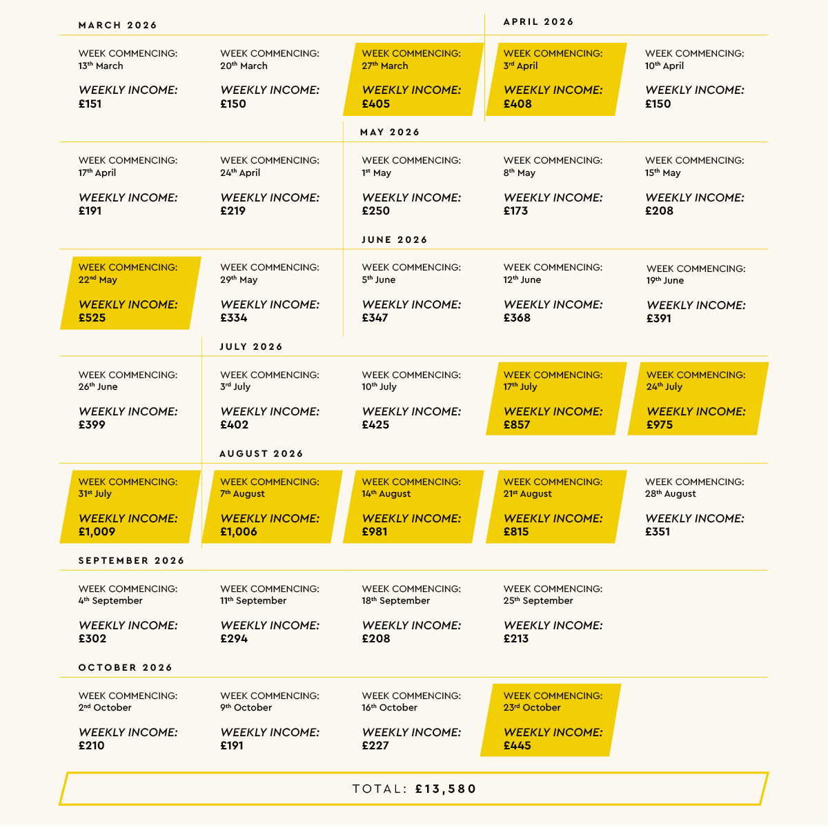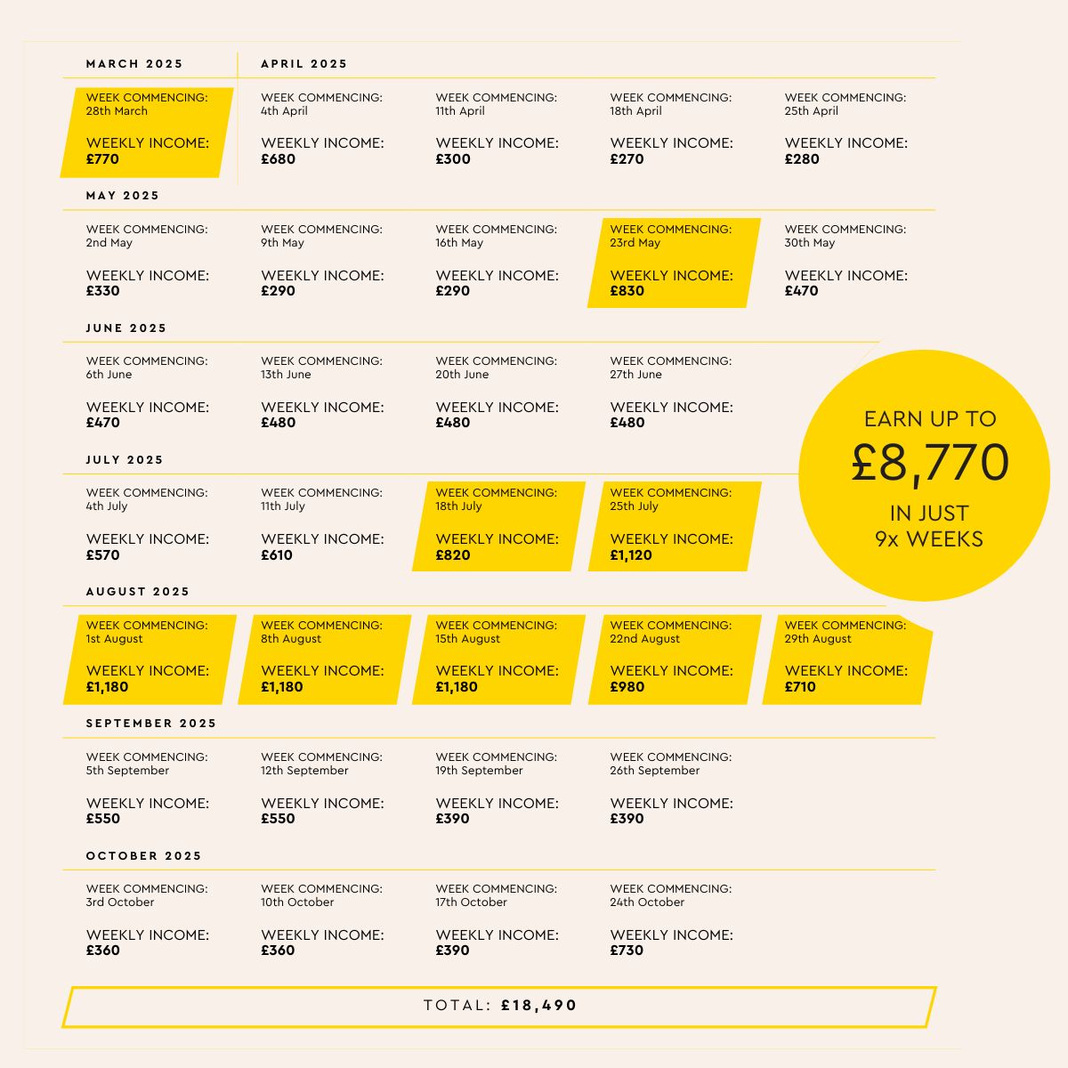 You could earn up to £21,300 a year from letting your holiday home with Waterside Holiday Group, or offset your yearly running costs in just 9 weeks – as highlighted in yellow below.**
