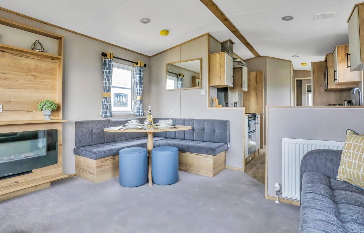 Discover the perfect blend of style and comfort with the ABI St Martin – a beautifully designed holiday home featuring a bright, open-plan living area with integrated seating, a statement electric fireplace, and large windows with views towards the Tregoad valley.