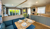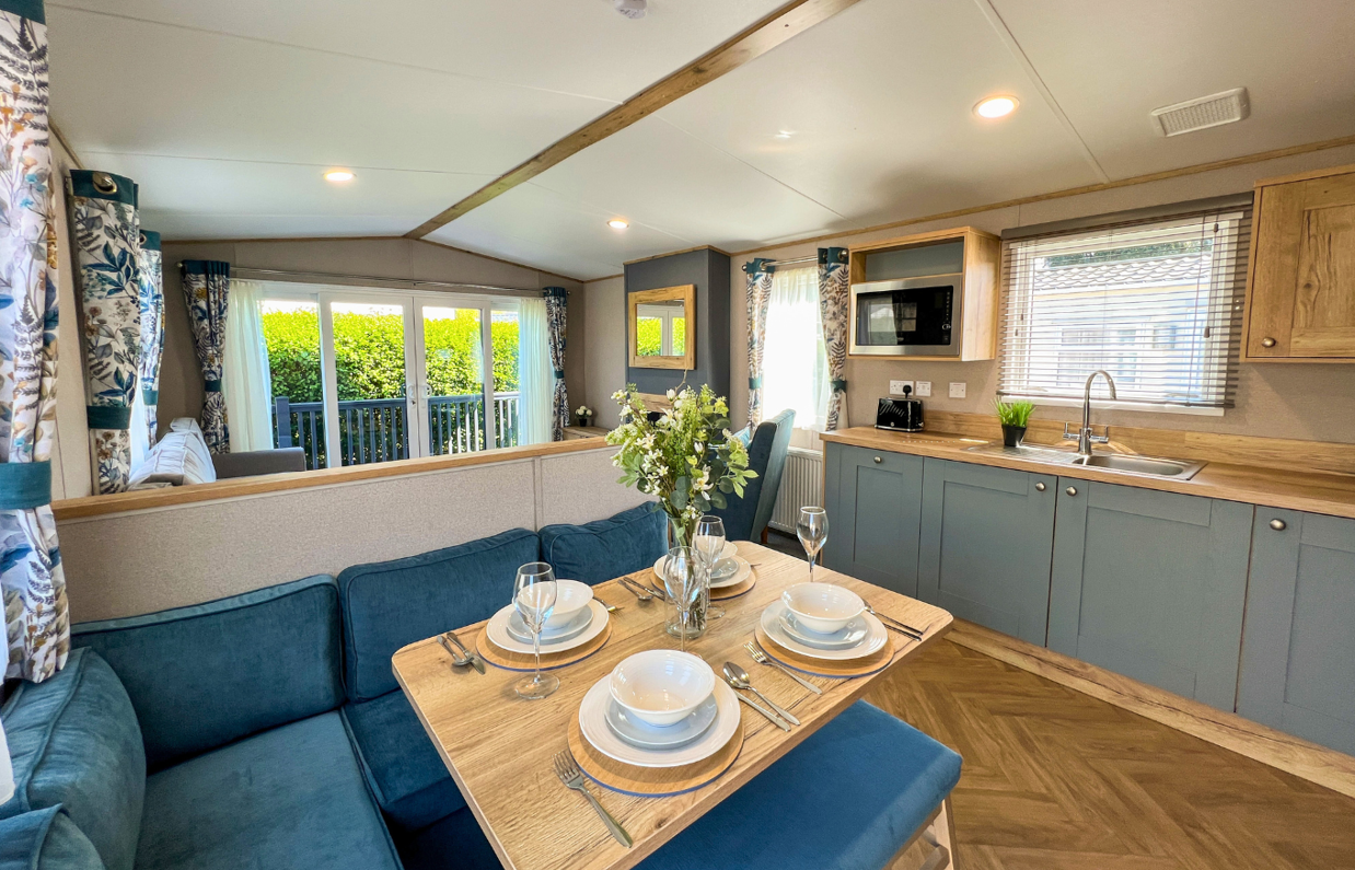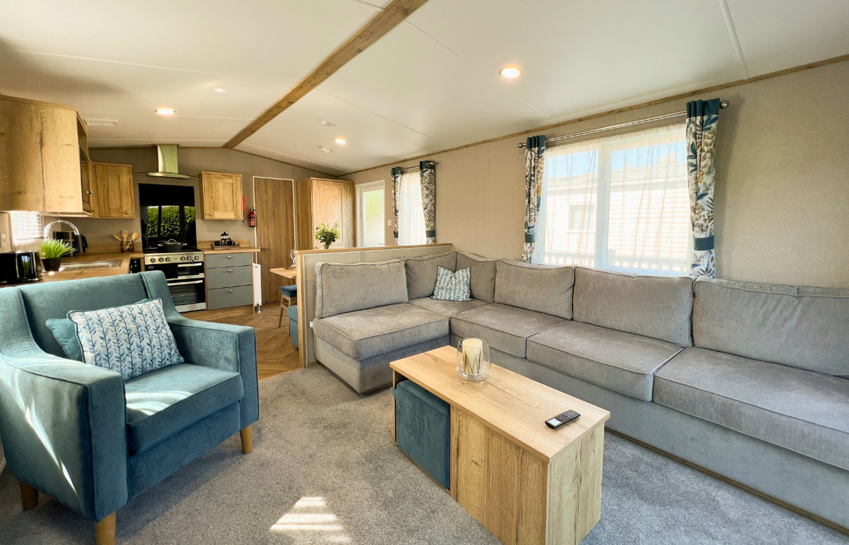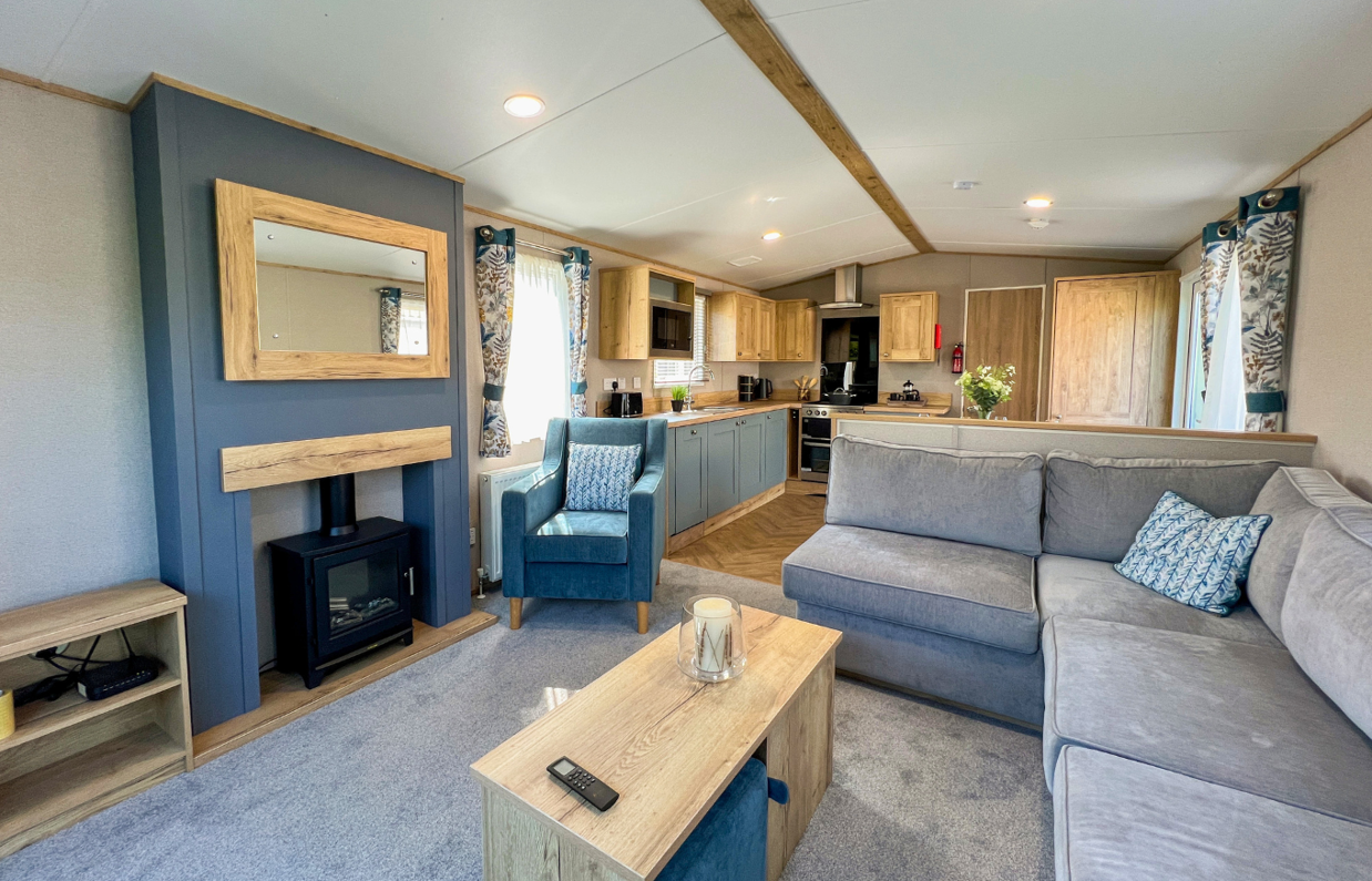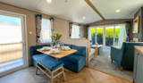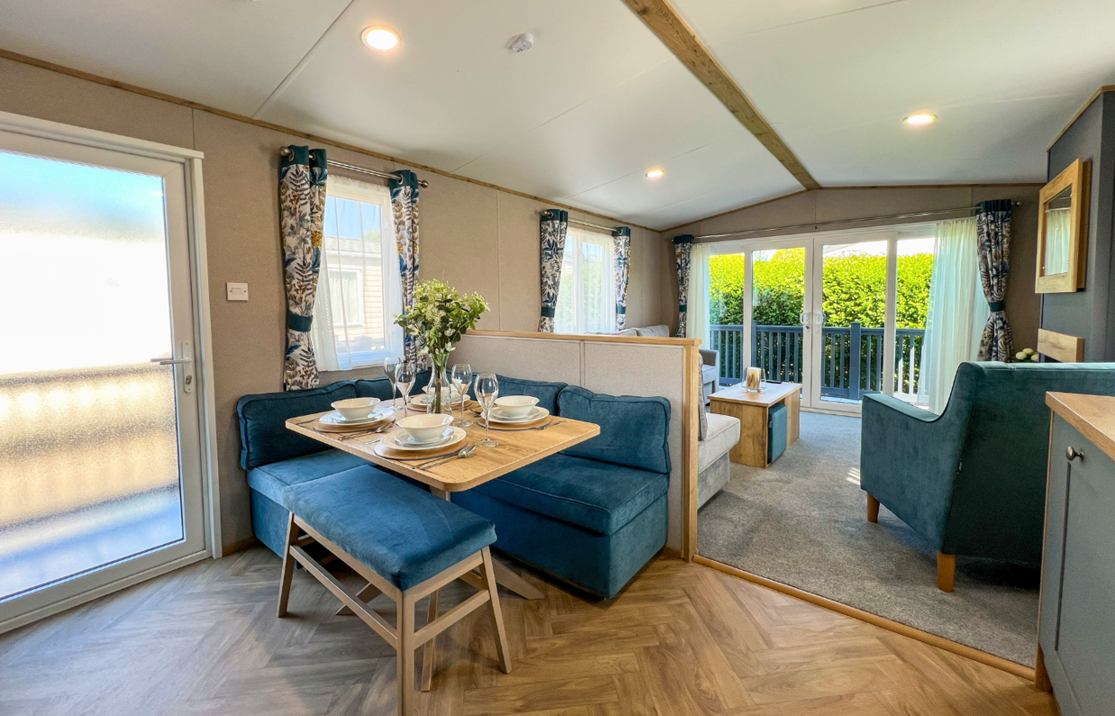 The spacious living area is designed to make the most of its peaceful setting, with front opening sliding doors allowing natural light to pour in and creating a seamless flow onto the full wrap-around decking – an ideal spot for relaxing or entertaining outdoors.