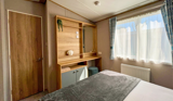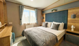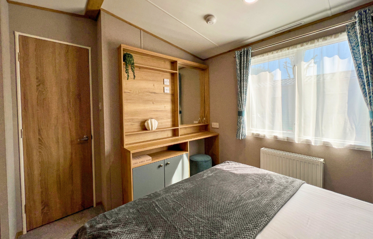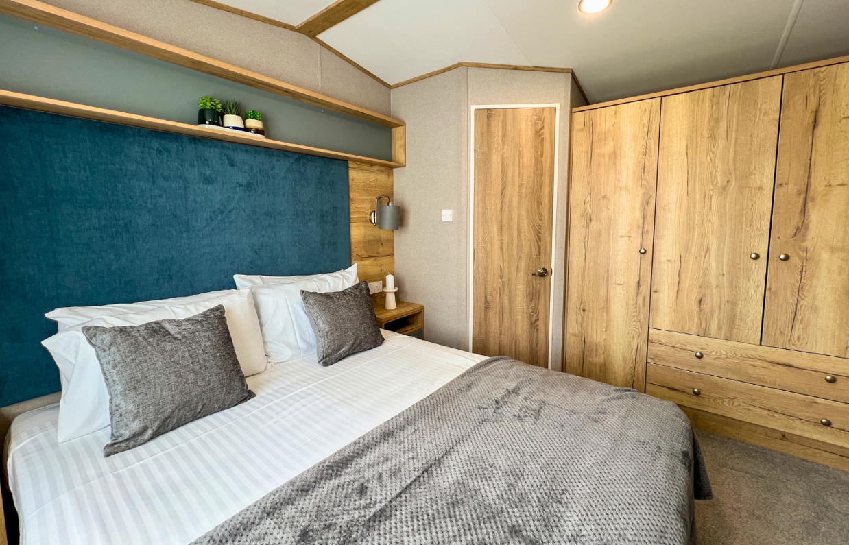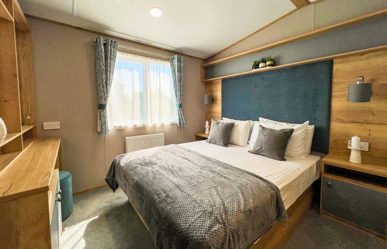 The beautifully styled master bedroom features a king-size bed, upholstered headboard, and en-suite WC, while the twin bedroom offers a cosy and practical space for guests or younger family members