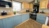 The shaker-style kitchen offers everything you need for holiday cooking, with integrated appliances and wood-effect worktops adding a rustic feel
