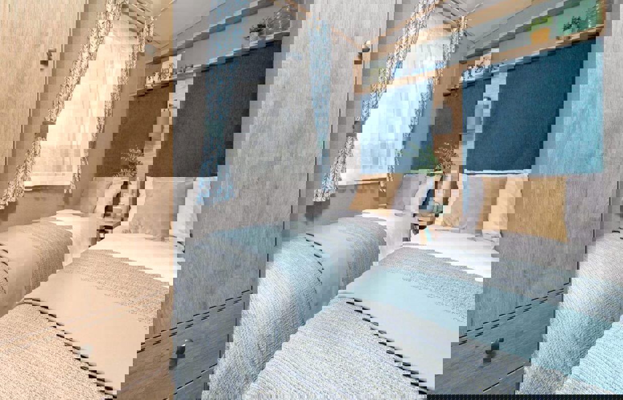 The beautifully styled master bedroom features a king-size bed, upholstered headboard, and en-suite WC, while the twin bedroom offers a cosy and practical space for guests or younger family members