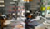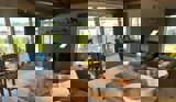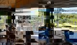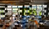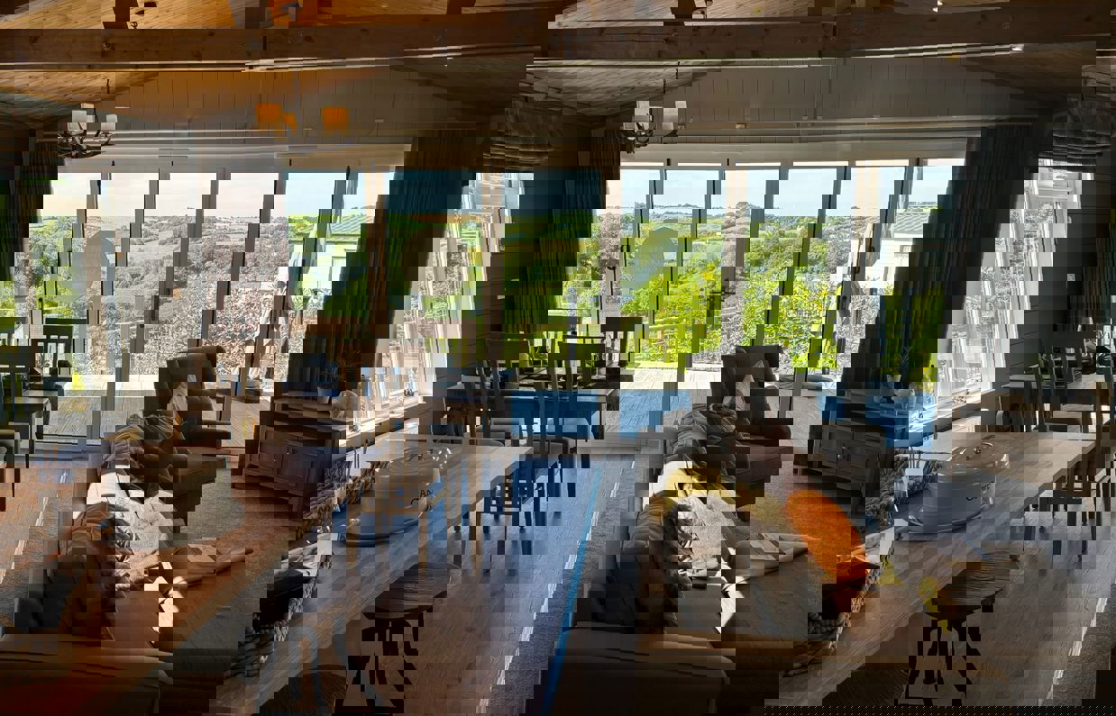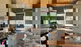 The open plan living area is snug but expansive with vaulted ceilings, large log-burner style fireplace, and country style dining table and chairs. The well designed layout creates a warm and open space for everyone to enjoy.