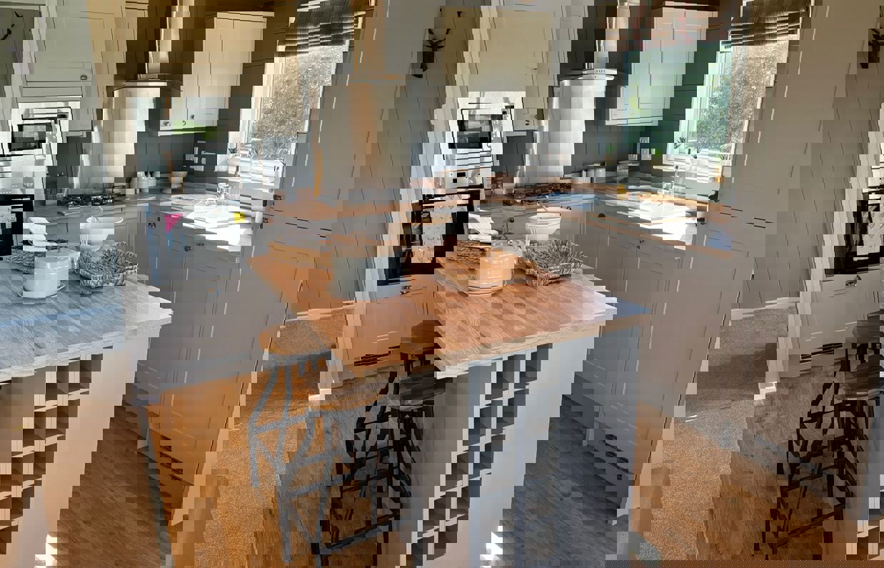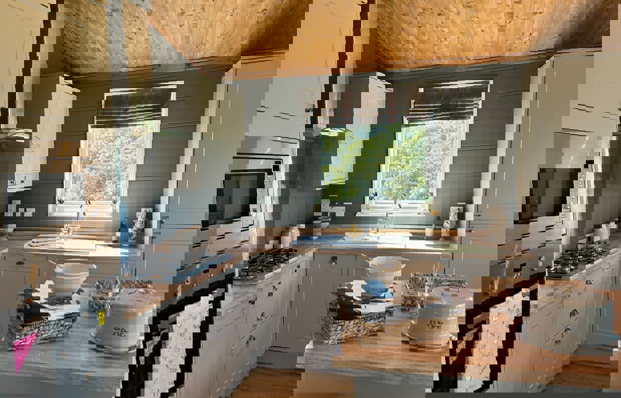 The contemporary country kitchen includes a large island with breakfast bar, shaker-style cabinets and comes fully equipped with integrated fridge/freezer, microwave, gas oven and hob, and dishwasher.