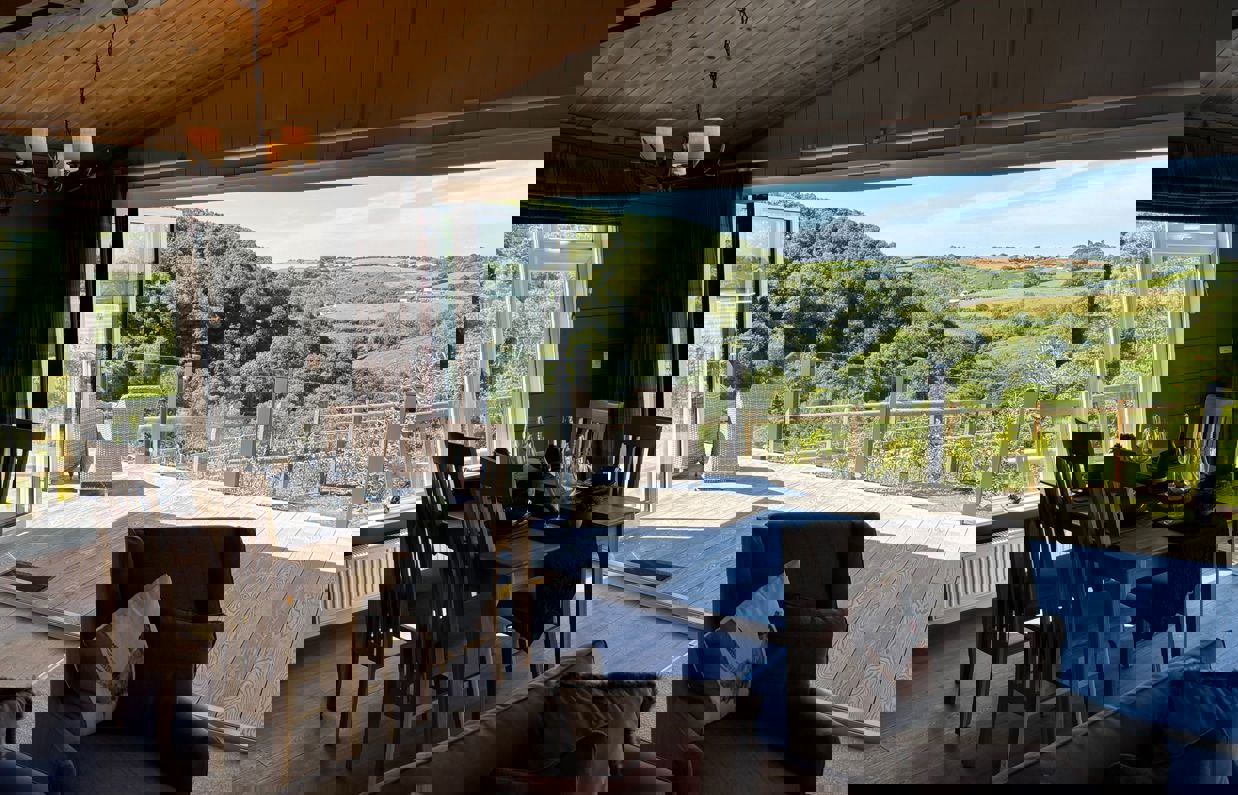 Full-width bi-fold patio doors open up the space, inviting the outdoors in and framing stunning views over the valley and out to the sea.