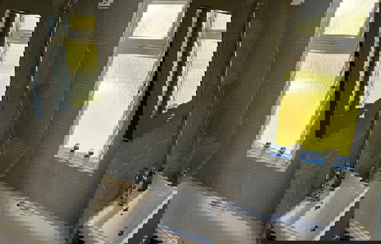 The second bedroom with twin beds is positioned next to the family bathroom with bath tub and integrated shower.