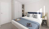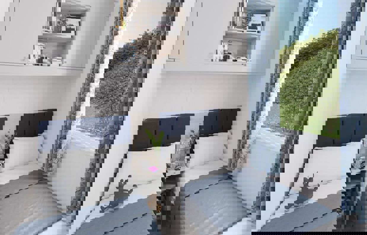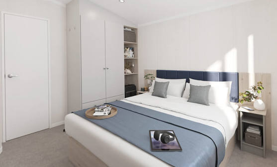 The master bedroom includes a king-size bed and en-suite bathroom, while the twin bedroom offers full-size single beds, wardrobe storage, and soft, restful tones throughout
