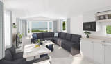 A fixed L-shaped sofa, large windows, and an open-plan space make the living area feel both light and cosy – a great space to relax after a day exploring the coast