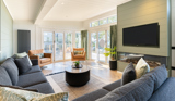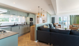Large open plan living area with huge comfy sofa, fireplace and bi-folds opening onto large decking