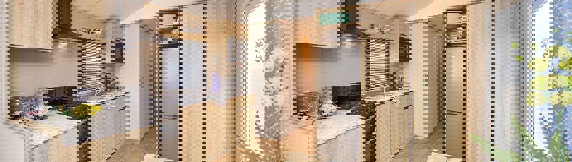 The fully equipped kitchen features wood-effect cabinets, marble-look countertops, and integrated appliances including a full oven, hob, fridge-freezer, and microwave.