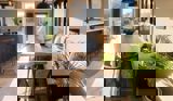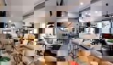 The dining area brings the outdoors in with the clever use of bi-fold windows behind the stylish and practical bench seating with storage. The dining table, chairs and lighting ooze industrial chic charm and blend well with the open plan kitchen area opposite.