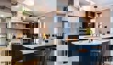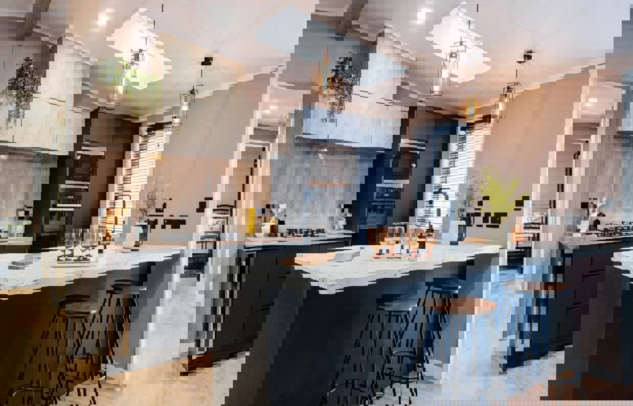The contemporary kitchen includes a large marble-style breakfast bar and worktop, and is beautifully styled with dark blue cabinets and light wood splashback and walls. It comes fully equipped with integrated fridge/freezer, microwave, gas oven and hob, dishwasher and even a wine cooler.