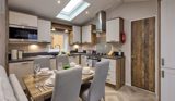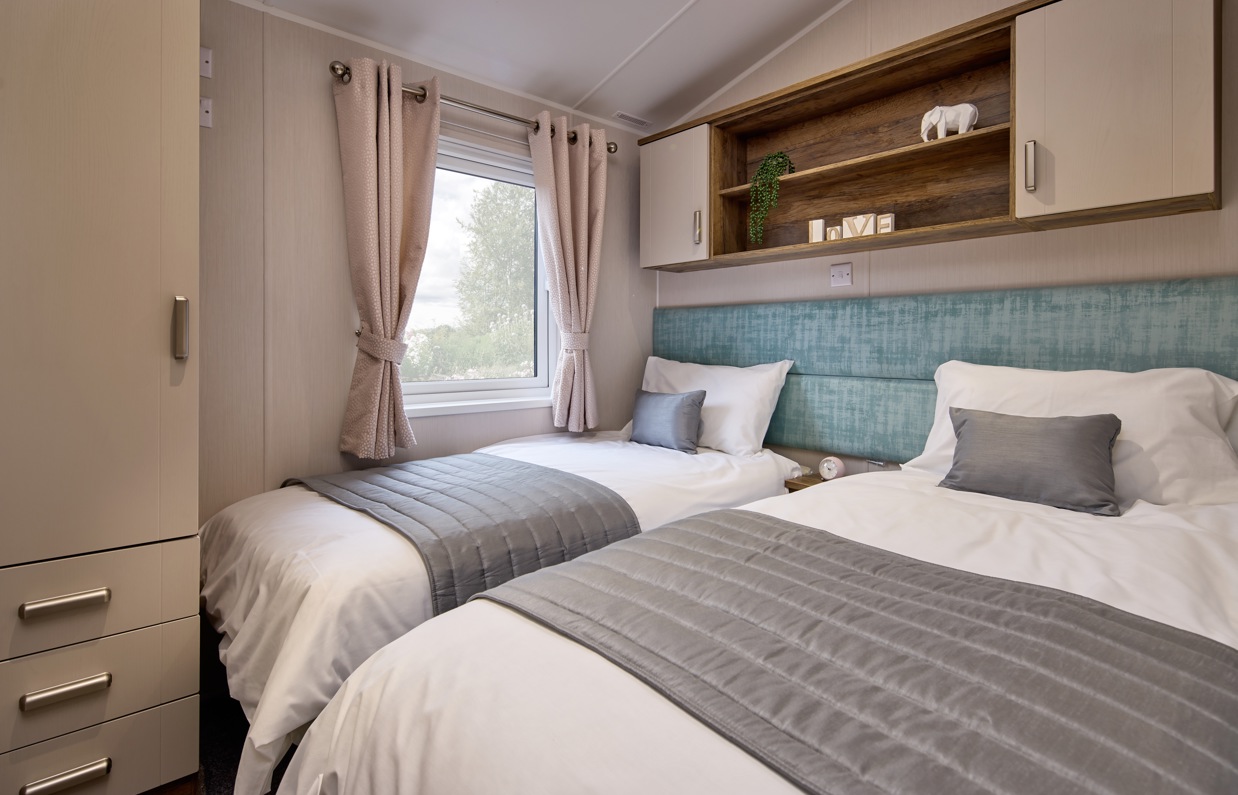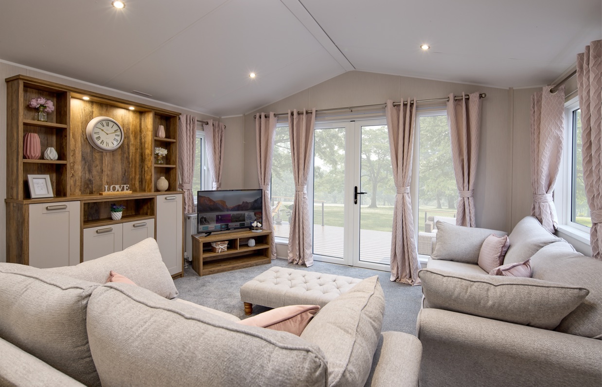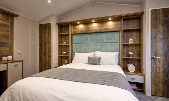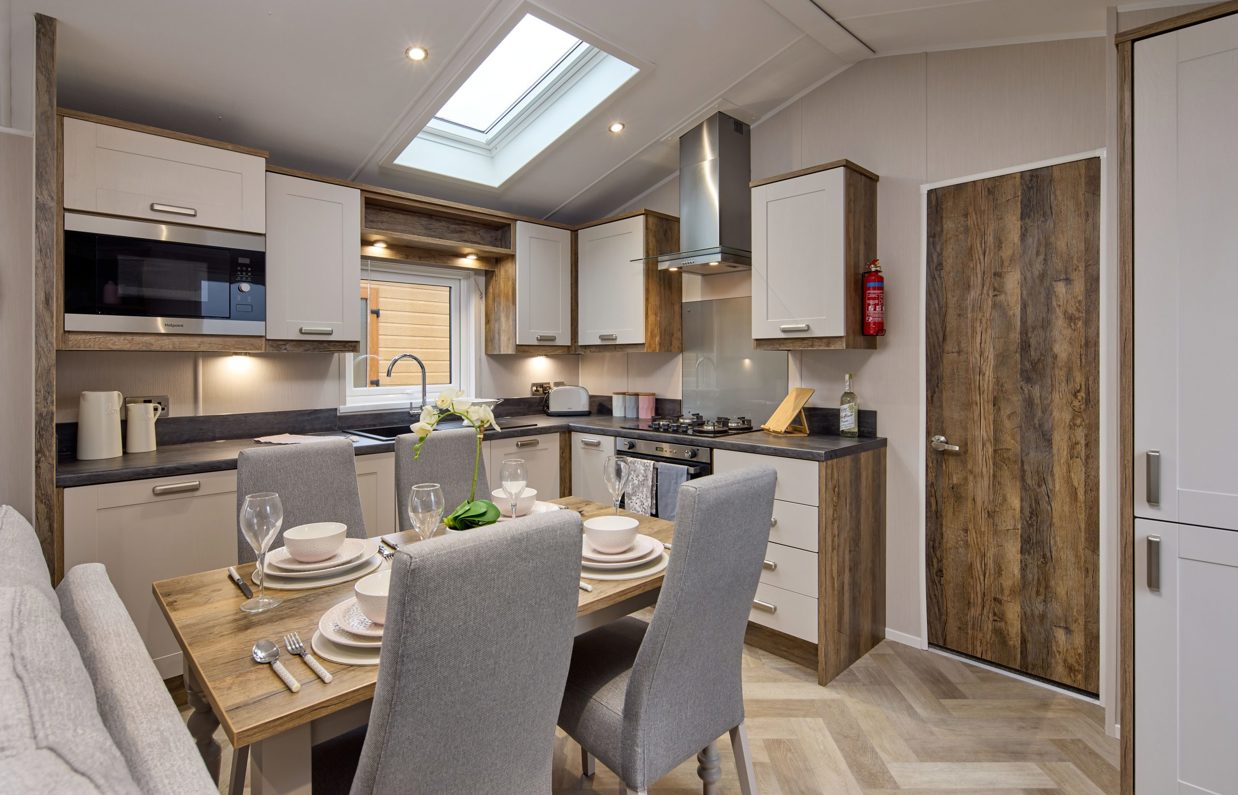 One of our premium holiday homes, the Sheraton has fantastic aesthetics and is available in a range of exterior finishes. The Sheraton’s lounge area is modern, spacious and a great place to unwind with family and friends. You’ll love the heritage feel with the feature dark oak wood effect fire and matching twin sofas of this holiday home.