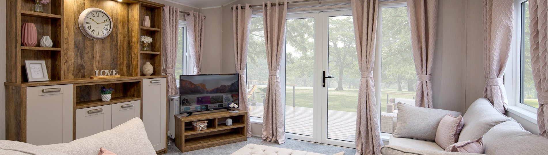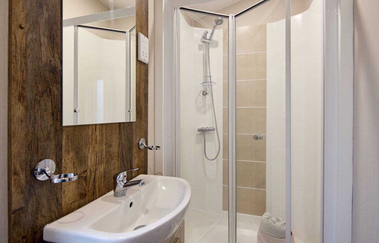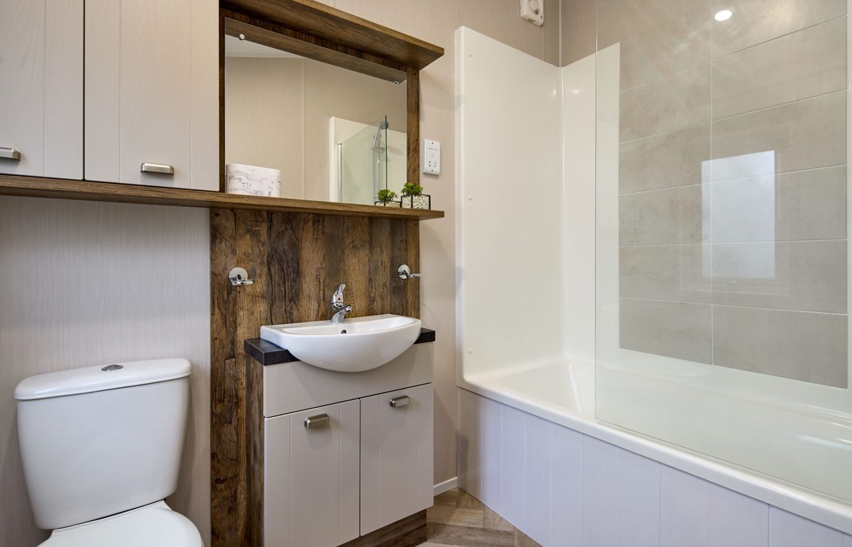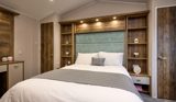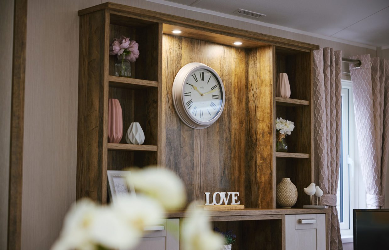 One of our premium holiday homes, the Sheraton has fantastic aesthetics and is available in a range of exterior finishes. The Sheraton’s lounge area is modern, spacious and a great place to unwind with family and friends. You’ll love the heritage feel with the feature dark oak wood effect fire and matching twin sofas of this holiday home.